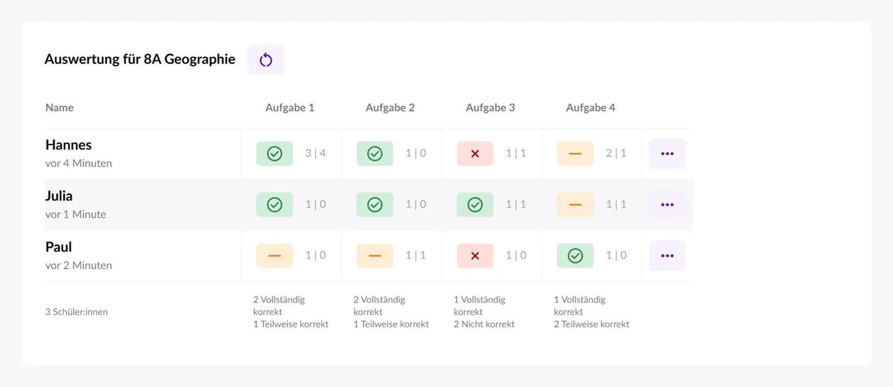 Sobald die Schüler:innen mit dem Material arbeiten, kann jederzeit verfolgt werden, wie die Lernenden damit arbeiten. Über den Bereich „Auswerten“ lässt sich der Fortschritt in Echtzeit aktualisieren und einsehen. Lehrkräfte erhalten hier einen Überblick über den Lernstand der Klasse sowie bei Bedarf detaillierte Einblicke in einzelne Antworten sowie benötigter Hilfestellungen.