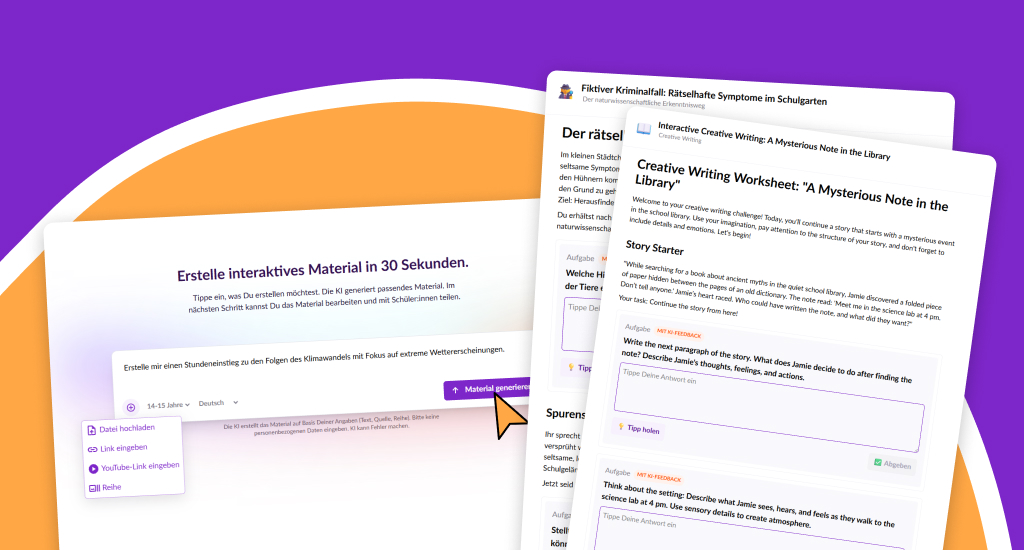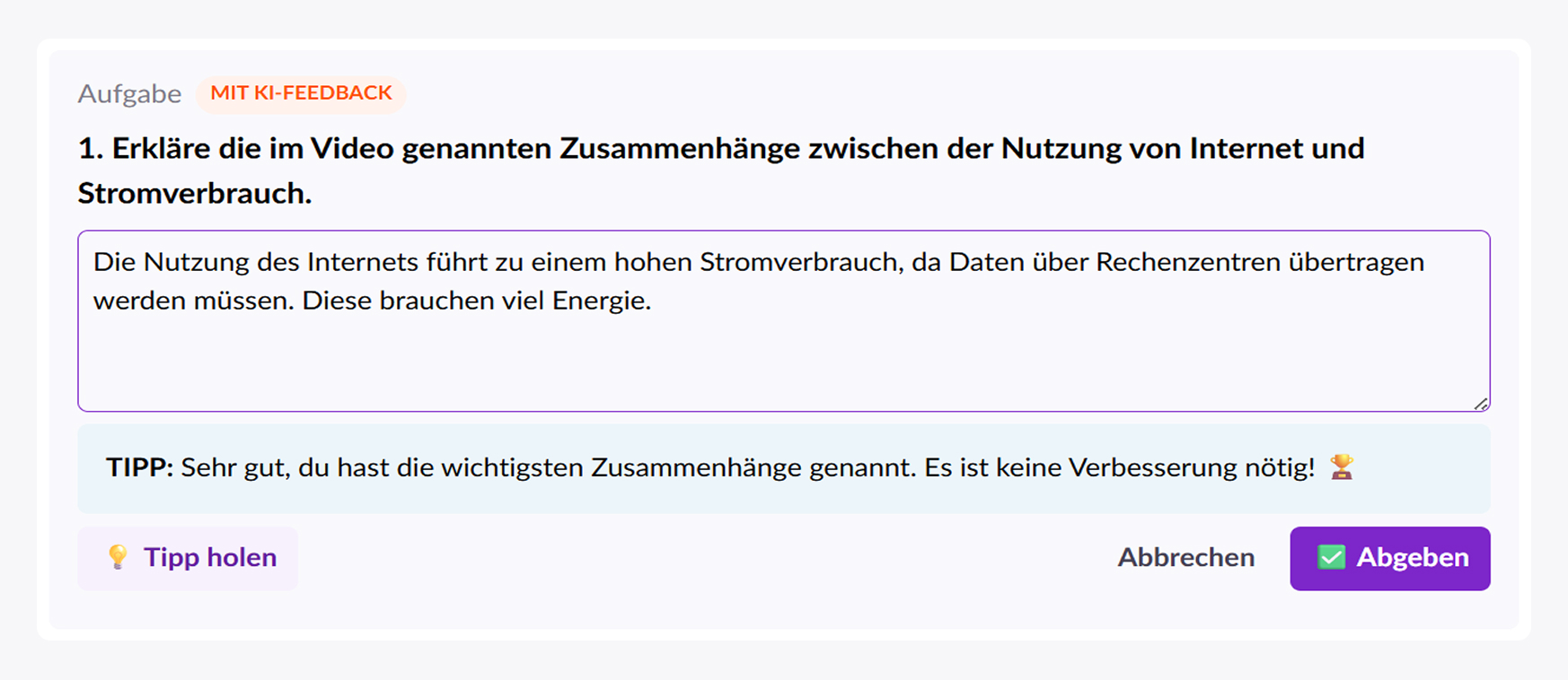 Über den Link können die Schüler:innen dann die interaktiven Materialien selbstständig bearbeiten. Dabei erhalten sie bei Bedarf personalisierte Tipps und nach Abgabe auch individuelles Feedback von der KI. Die Schüler:innen können ihre Antworten so lange bearbeiten, bis sie zufrieden mit der Antwort und dem Feedback sind.