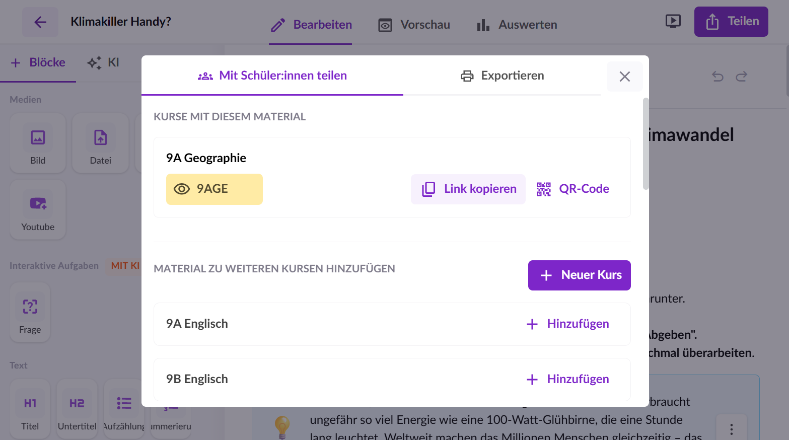 Um ein Material mit Schüler:innen im Unterricht zu verwenden, kann es zuvor ganz einfach mit der entsprechenden Lerngruppe geteilt wurde. Das Material kann dafür über den Button „Teilen“ zugänglich gemacht werden. Lehrkräfte haben dabei die Möglichkeit, entweder einen Link für die Schüler:innen zu erzeugen oder einen QR-Code direkt an der digitalen Tafel anzuzeigen.